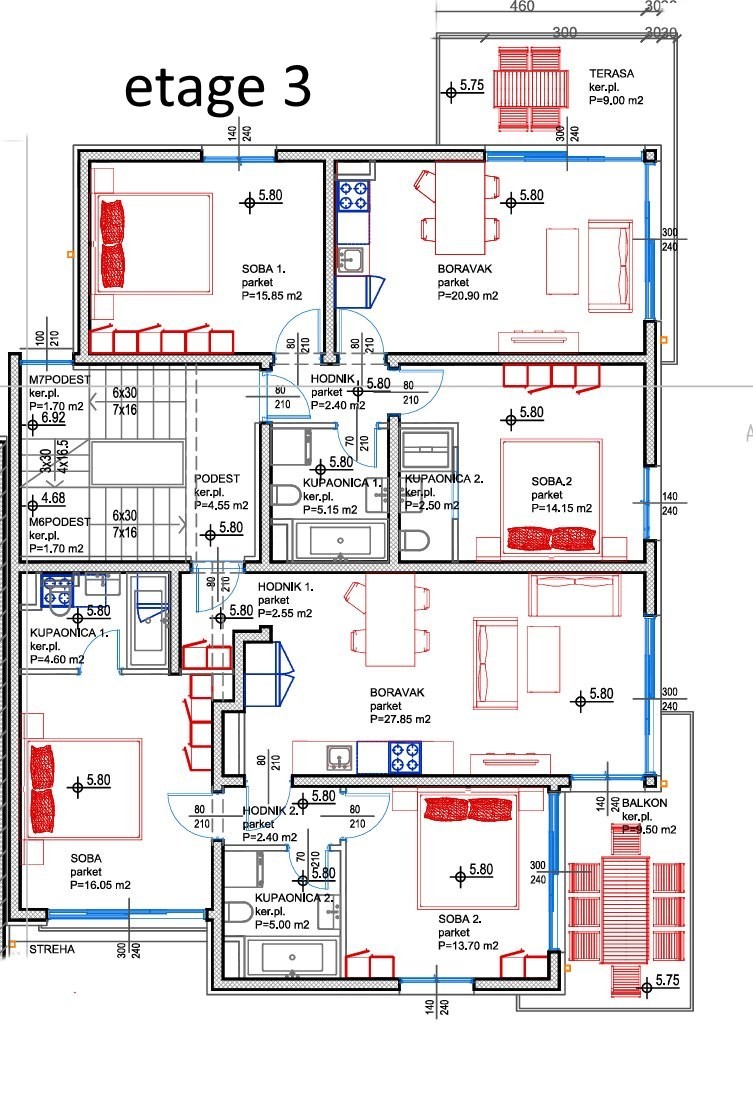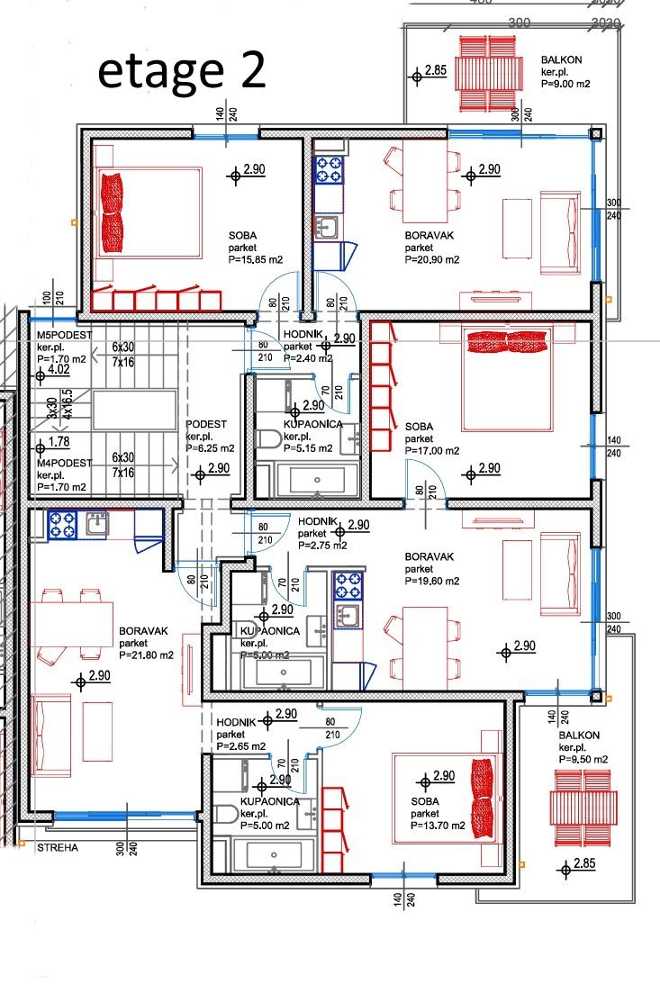Apartamenty mają 1 lub 2 sypialnie. Mniejsze apartamenty (parter i 1. piętro) mają powierzchnię 43m² – 44m², z balkonem 9m² – 10m². Większe apartamenty (2. piętro) mają 61m² + balkon 9m² oraz 72m² + balkon 9,50m².