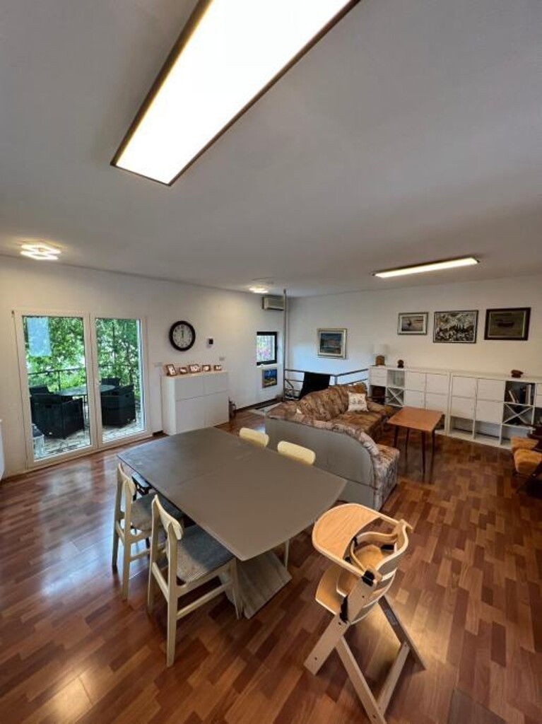 Piętro: wewnętrzne schody prowadzą do przestronnego salonu o otwartym planie połączonego z kuchnią. Z tej strefy wyjście na otwarty taras z panoramicznym widokiem na morze, góry i Split.